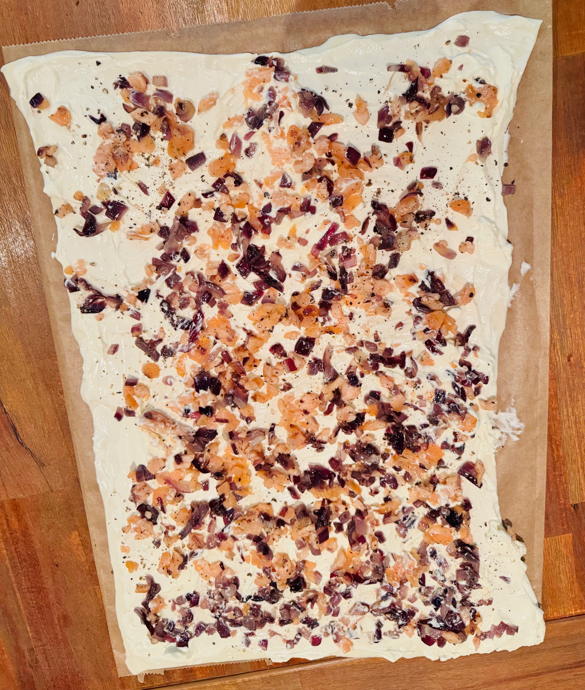 Ihr rollt eine Packung Blätterteig aus und bestreicht diese gleichmäßig mit dem Schmand. Dann verteilt Ihr die Zwiebel-Lachs-Mischung auf der mit Schmand bestrichenen Blätterteigplatte. Zum Schluss noch etwas frischen Zitronensaft auf die Füllung träufeln. Gerne auch Zitronenabrieb drüberstreuen.