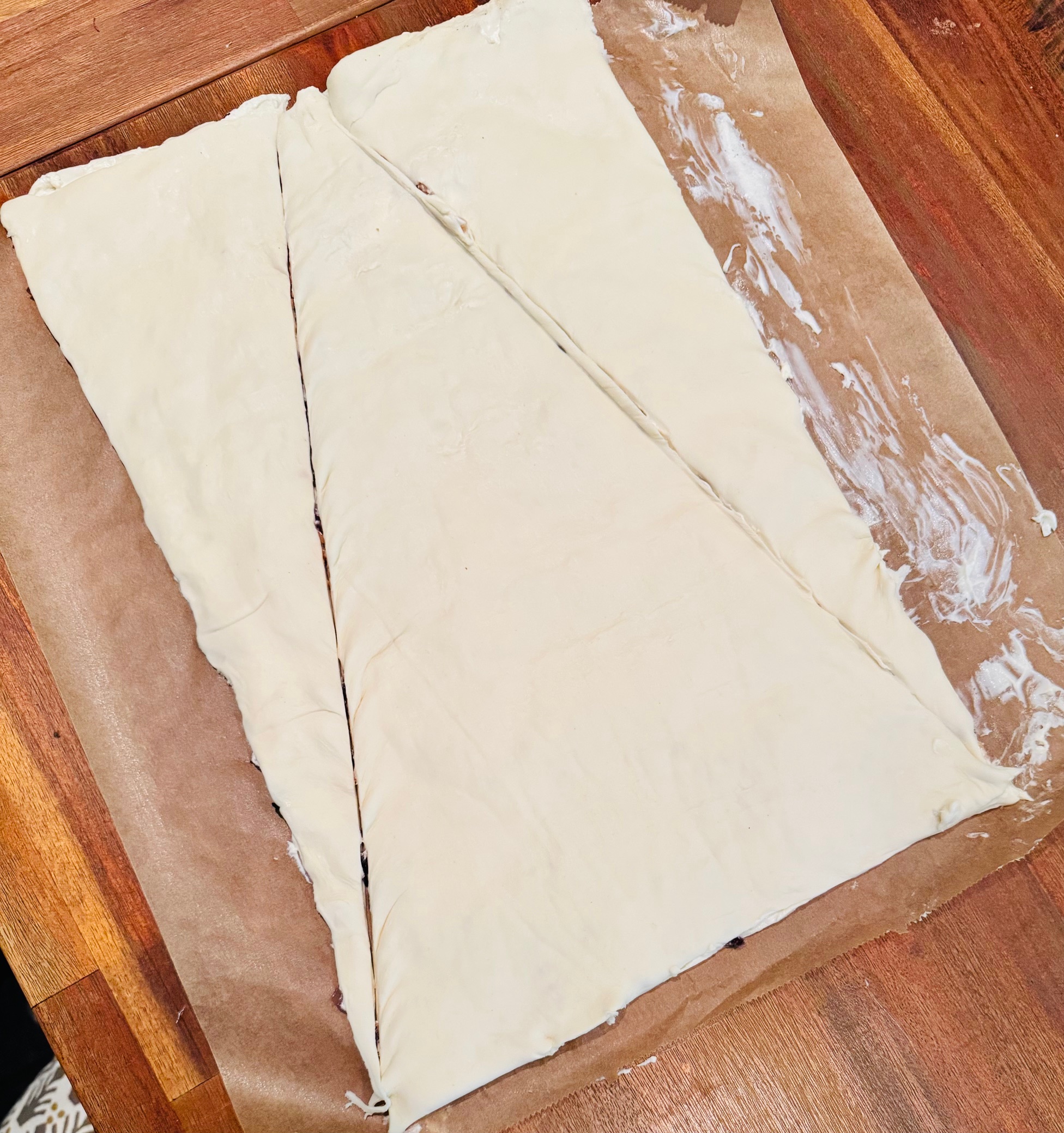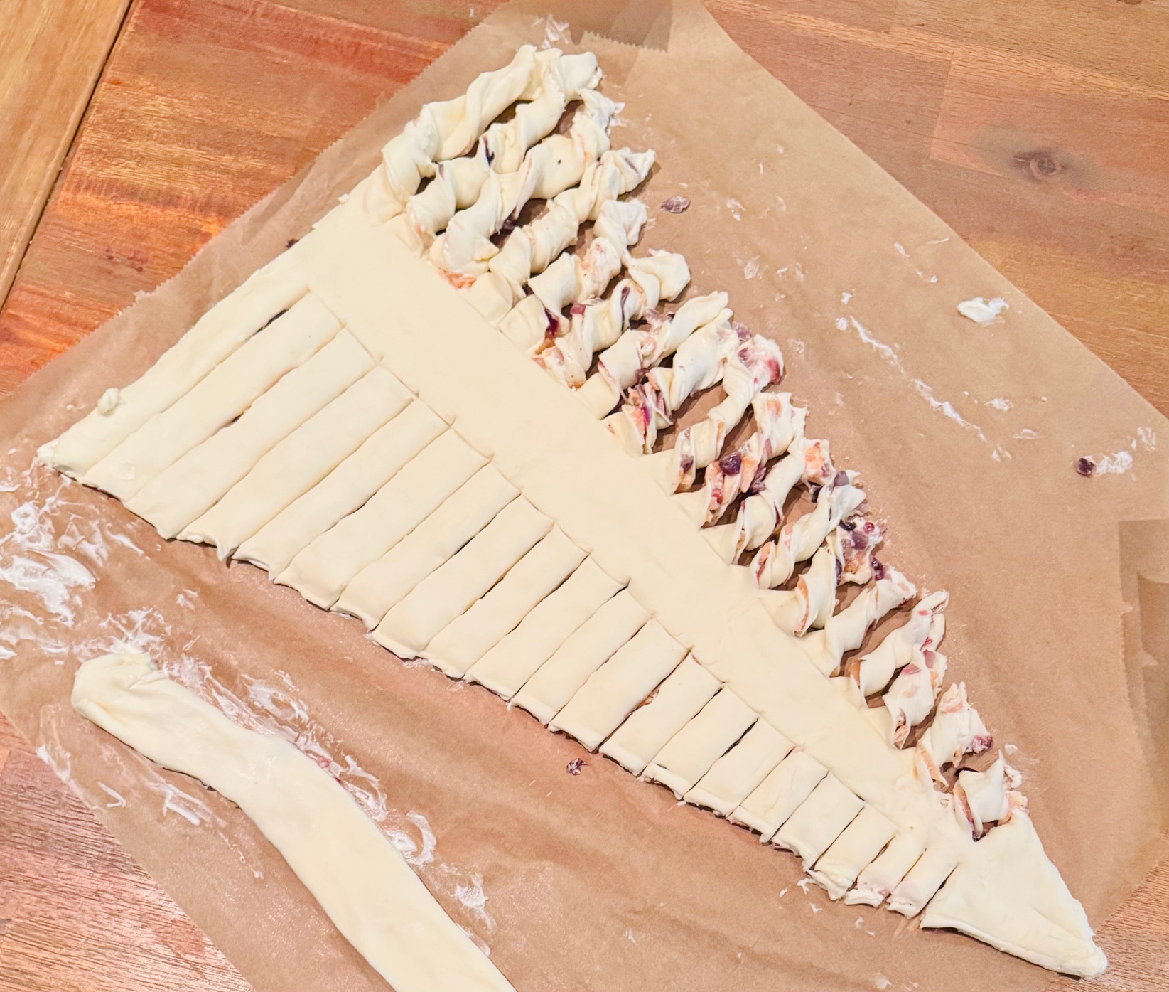 Alles, was außerhalb des Baums an gefülltem Teig liegt, in Streifen schneiden und die Streifen verwirbeln. Bitte einen Streifen als Baumstumpf übrig lassen.