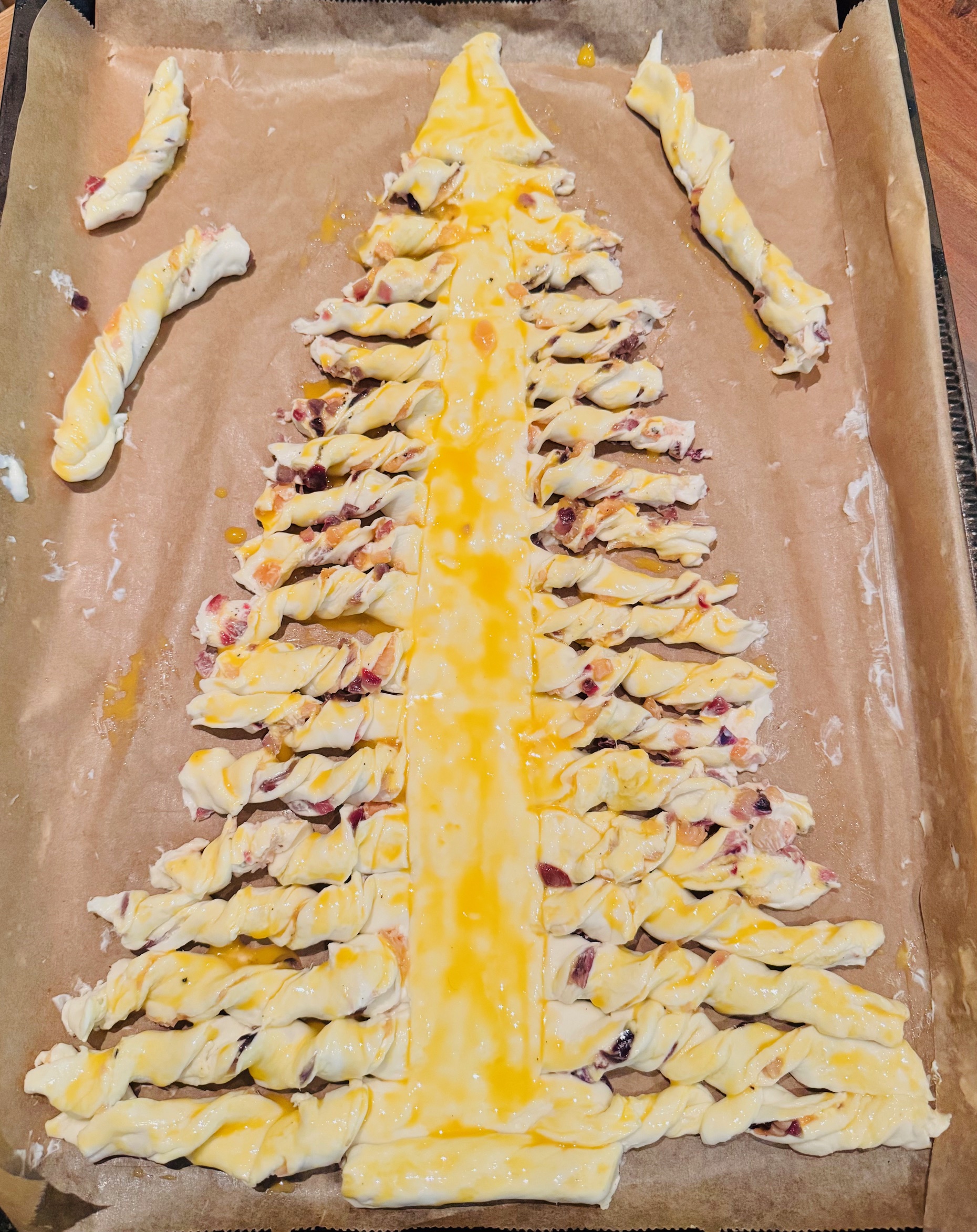 Verquirlt das Eigelb und bestreicht den ganzen Baum, wie auch die Stangen, die Ihr aus den „Resten“ gedreht habt.